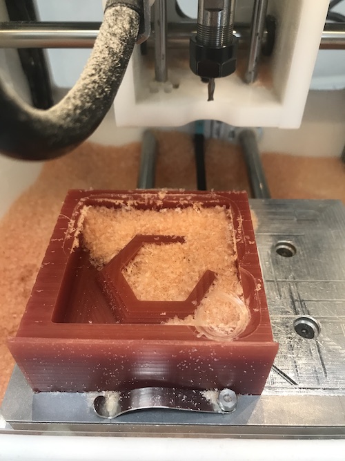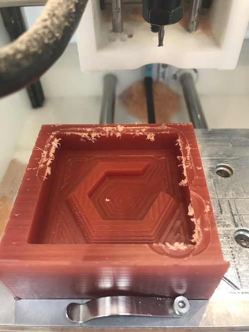 I used the Nitto tape to tape my wax in the bottom left corner as usual. Near the end of the milling job, the bit collet ran into the wax and the job had to be stopped. Luckily, enough of the mold had been milled that it looked to be usable. I had to vaccuum out the milling machine, but here is the final mold: