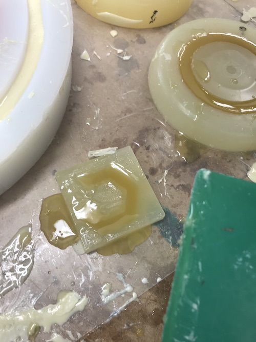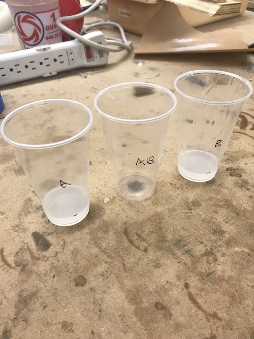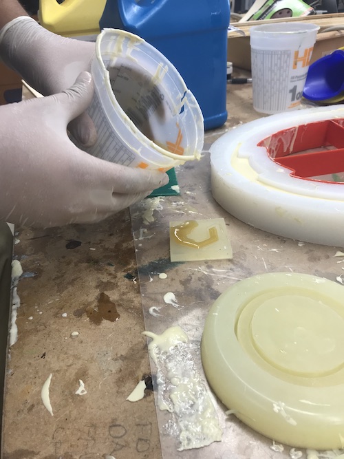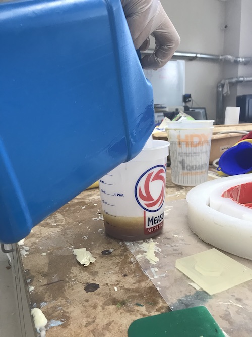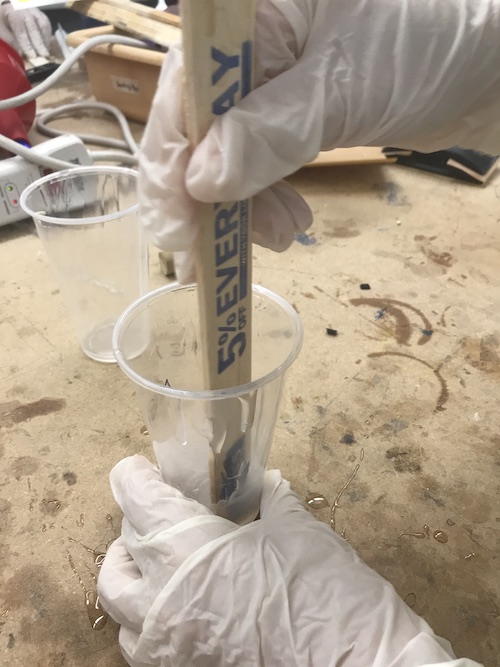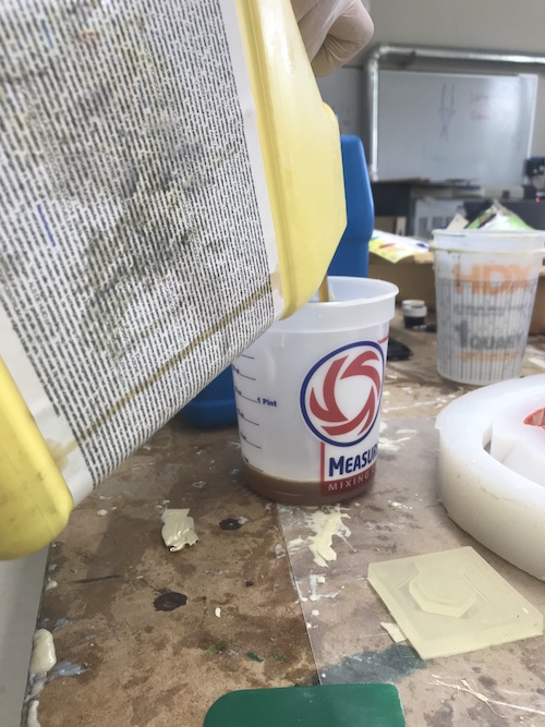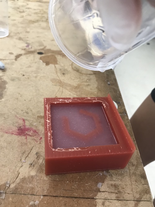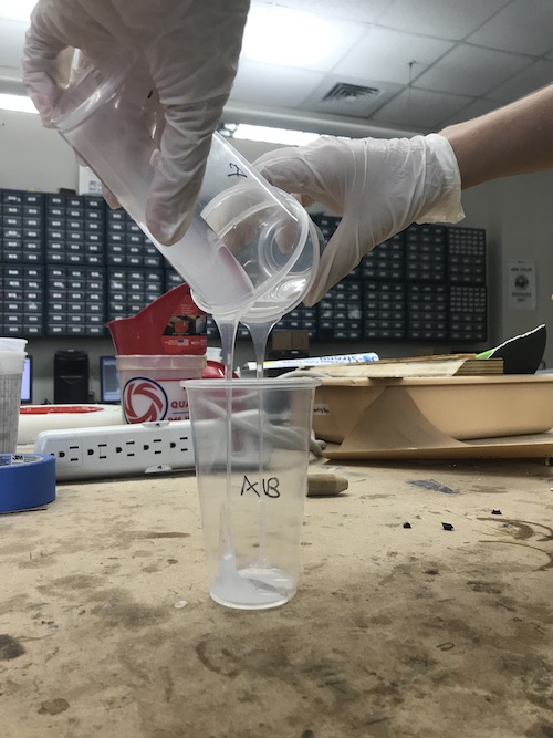 The next step was creating the mold from the wax. I used Smooth-On EcoFlexto do this. I first put equal parts of A and B into their own cups. I then mixed them at the same time into a different cup and mixed them together. After thoroughly stirring the mixture, I poured it into my milled wax.
