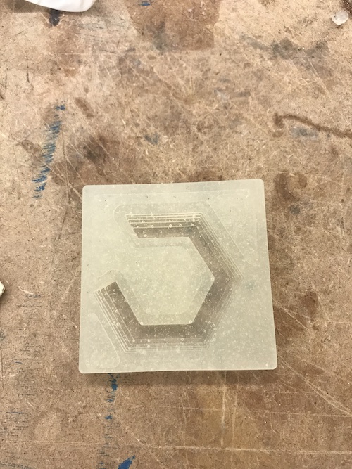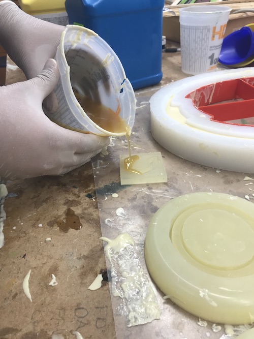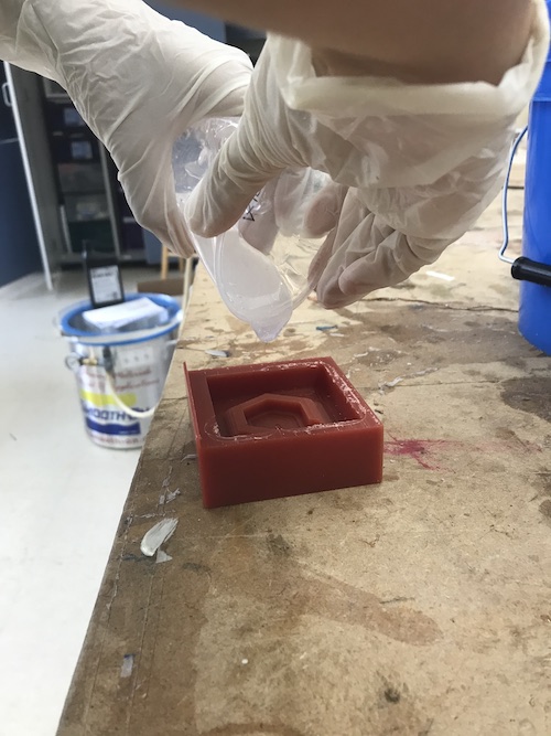 The last step was casting my design. I used Smooth-On Task 8 for this. To create the mixture, part A was poured into a bucket, then an equal amount of part B was added into the bucket. After being quickly but thoroughly stirred, the mixture was poured into my mold. It had to be stirred quickly because Task 8 sets quickly.