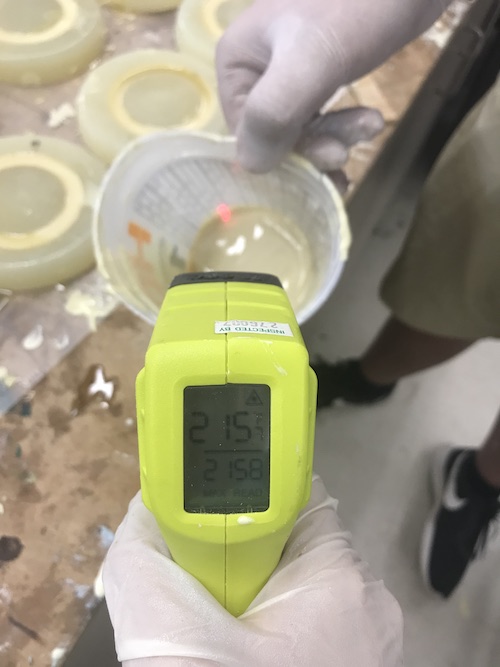 I took the temperatures of my cast and the bucket with the Task 8 mixture, and you can see that it heated up quite a bit. I had to wait until the cast was well below 80˚ to take it out of the mold.