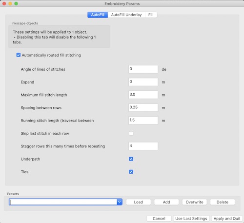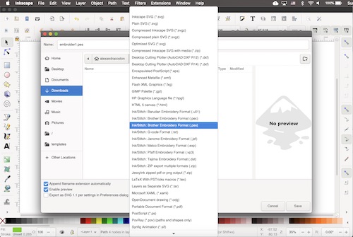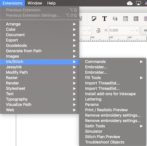 The first software was Ink/Stitch, “an open source machine embroidery design platform based on Inkscape.” I downloaded the software on my Mac by following these steps. I put the download into the ‘extensions’ folder in my Inkscape folder.