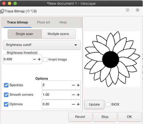 I chose a simple image of a sunflower from Google to use because I like plants and COVID-19 has sparked my recent passion for gardening. I put the image in Inkscape.