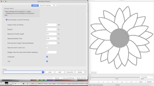 Once the flower was done, I needed to create the embroidery file. I selected the whole thing and grouped it by clicking Object -> Group. I then made the Object to Path and clicked Params to run the simulation. I left the default settings and clicked Apply and Quit. You can see the simulation here: