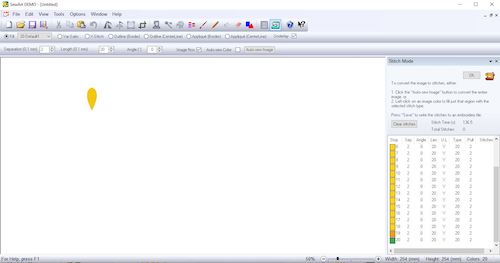 I then went to Tools -> Convert to Stitches to change the image into a stitches for the embroidery file. I then clicked Auto-Sew Image to automatically generate the stitches. After a couple minutes, it created the stitches for each part of the design. It picked up some lighter shades of colors that weren’t there or were not necessary, so I deleted all the colors that were not the same shades of my three colors: yellow, orange, and green.