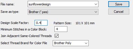 I then saved the file. It originally saved it as a .tif file, but I was immediately prompted to save it as a different file type afterwards. I saved it as a .pes for our embroidery machine. I also scaled it down so that it would be the size I wanted. It automatically saved it as four different files: .tif, .pes, .saf, and .txt.