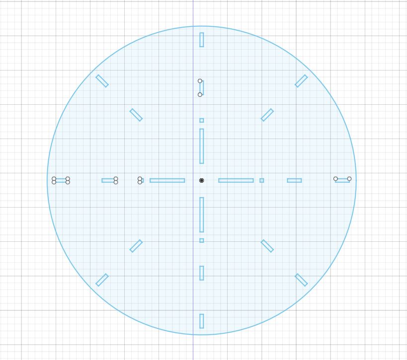 The next step was to make an alternative design for the living hinge that would have wrapped around the triangular pieces that are placed on the base piece. At first, I thouhgt about getting rid of the triangles completely, and instead I would create circular pieces that would stack on top of eachother in order to make the shape of the UFO. The design would involve creating spacers, which would be 4 circles each 0.5 thick and 4 inches in diameter in order to be 2 inches high, and 4 of these stacks would be spread around the UFO. The space in between the top circle and the bottom circle should be roughly about 11 inches, so I would place 4 and 1/2 spacers and 4 circles in order to complete the space in between the two pieces. But After thinking about the size of the design, I realized that I would be wasting a lot of wood in the process, so I decided that I would stick with a design that involved my triangular pieces.