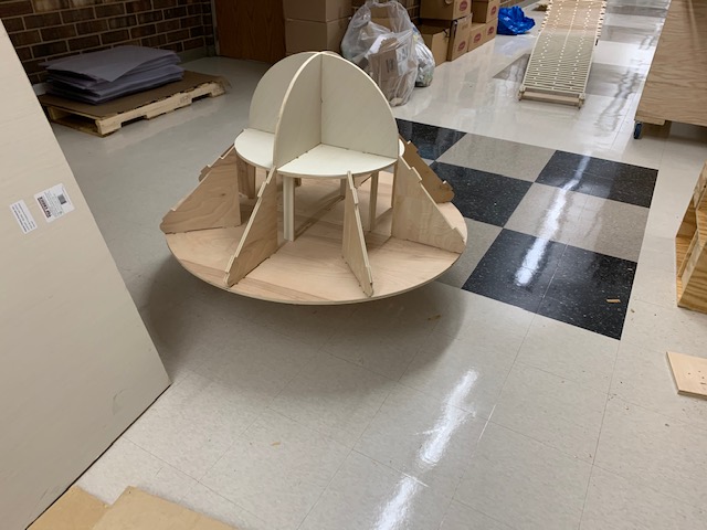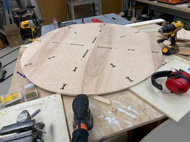 After this was done, I sanded down some of the edges on all of the pieces, and then I fitted the legs onto the the circular base first: