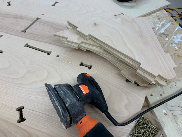 Following the steps, I got ready to cut by screwing on a new sheet of half inch wood onto the bed. Once I got the piece of wood set on the bed, I warmed up the spindle, homed the x,y, and z planes, and I tried out my cut with a 3D offset, also known as an aircut, to see if everything was ok, which it seemed it was,and I got to the actual cutting. I carried through the rest of the steps listed, and cnce all my pieces were cut, I got on top of the ShopBot, and I sanded down everything with the sander, since it would be easier with everything still intact on the bed.