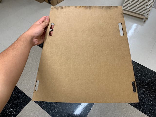 As soon as my cut was complete, I got my trapezoid like piece uploaded to the computer connected to the laser cutter and I got some cardboard and cut out the piece that I needed. After the piece was cut out, I scored it, hoping for a curved shape. The piece ended up looking like this: