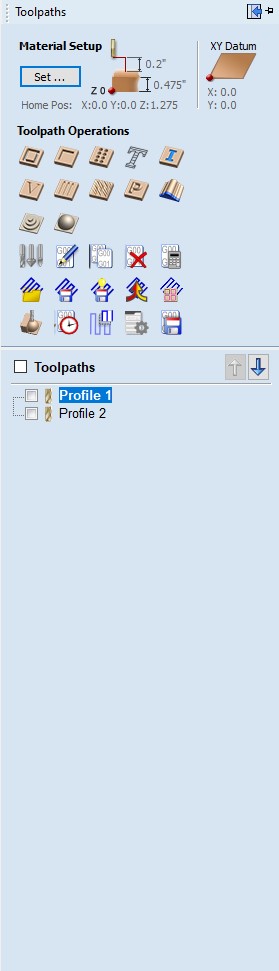 Once this was complete, I looked for any opened vectors, and there were none, so I proceeded to create my t-bone filets. After the filets were complete, it was time for me to create the toolpaths. I clicked on the toolpaths menu button, which pulled out a tab with many different things that I could do which looked like this: