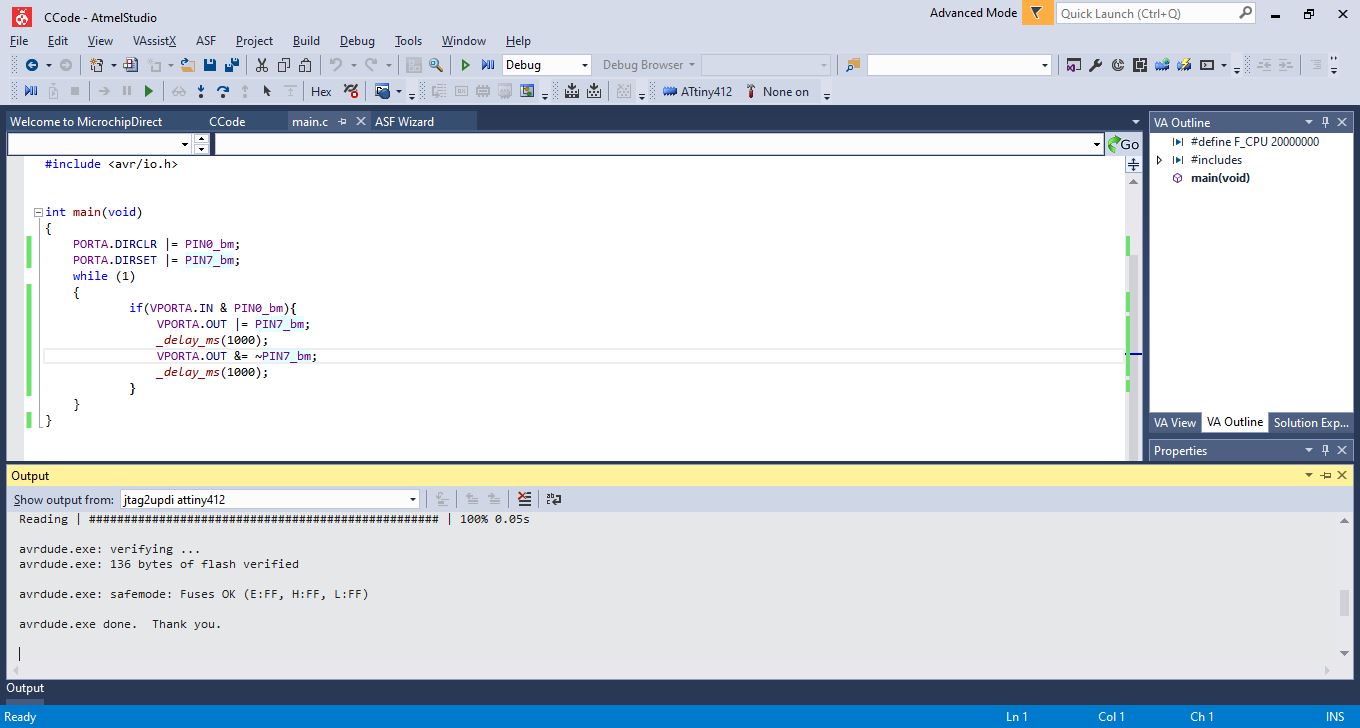 After doing this, I decided to do some work in Atmel Studio 7, which I used a little bit when creating our programmers, but this time I would have to get the code to upload from here. The first thing I did was that I created a new executable project. After that, I selected my board that I would program, which is the tiny 412. After I did that,I inserted my code, and made a few tweaks so that it would run on Atmel. Once I did this, I compiled the file using the compile button under build.