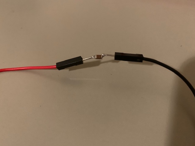 After I completed this, I opened the blink example code, and entered my pin information on there. After I did this, But after I did this, I ran into my first issue which was that I needed a 10uF capacitor between the reset and the ground because a reset is triggered every time I upload a sketch, but I did not have the part. After some thinking, I dug through my previous boards and I was able to find a 1uF capacitor soldered on one of my boards, so I got my soldering iron, and I took off the capacitor, and was able to solder the capacitor back onto two male to male pins, which looked like this