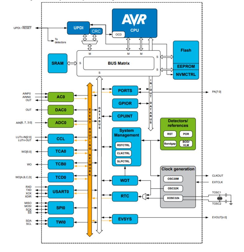 The second image shows the block diagram of the tiny 412, and this was interesting to look at and to see all of the parts of the MCU. I never thought that so many parts and functions could be packed inside such as small package! I also thought that one interesting part of this diagram were the placements of SRAM, Flash, and EEPROM, and how that would have an effect on the perforance of the board.