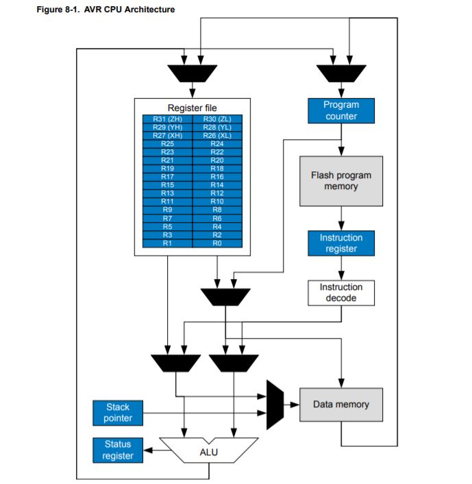 The fourth image shows the AVR CPU architecture, which was interesting to see because we can see how the processor works and the order in which information is handeled.