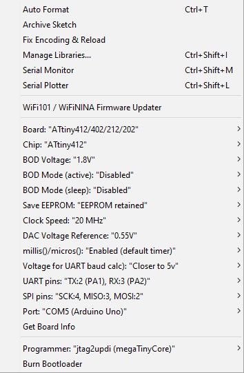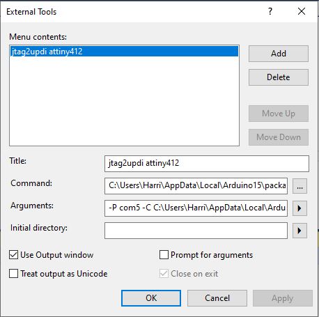 -P com5 -C C:\Users\Harri\AppData\Local\Arduino15\packages\megaTinyCore\hardware\megaavr\1.1.8\avrdude.conf -c jtag2updi -p t412 -U flash:w:$(ProjectDir)Debug\$(TargetName).hex:i