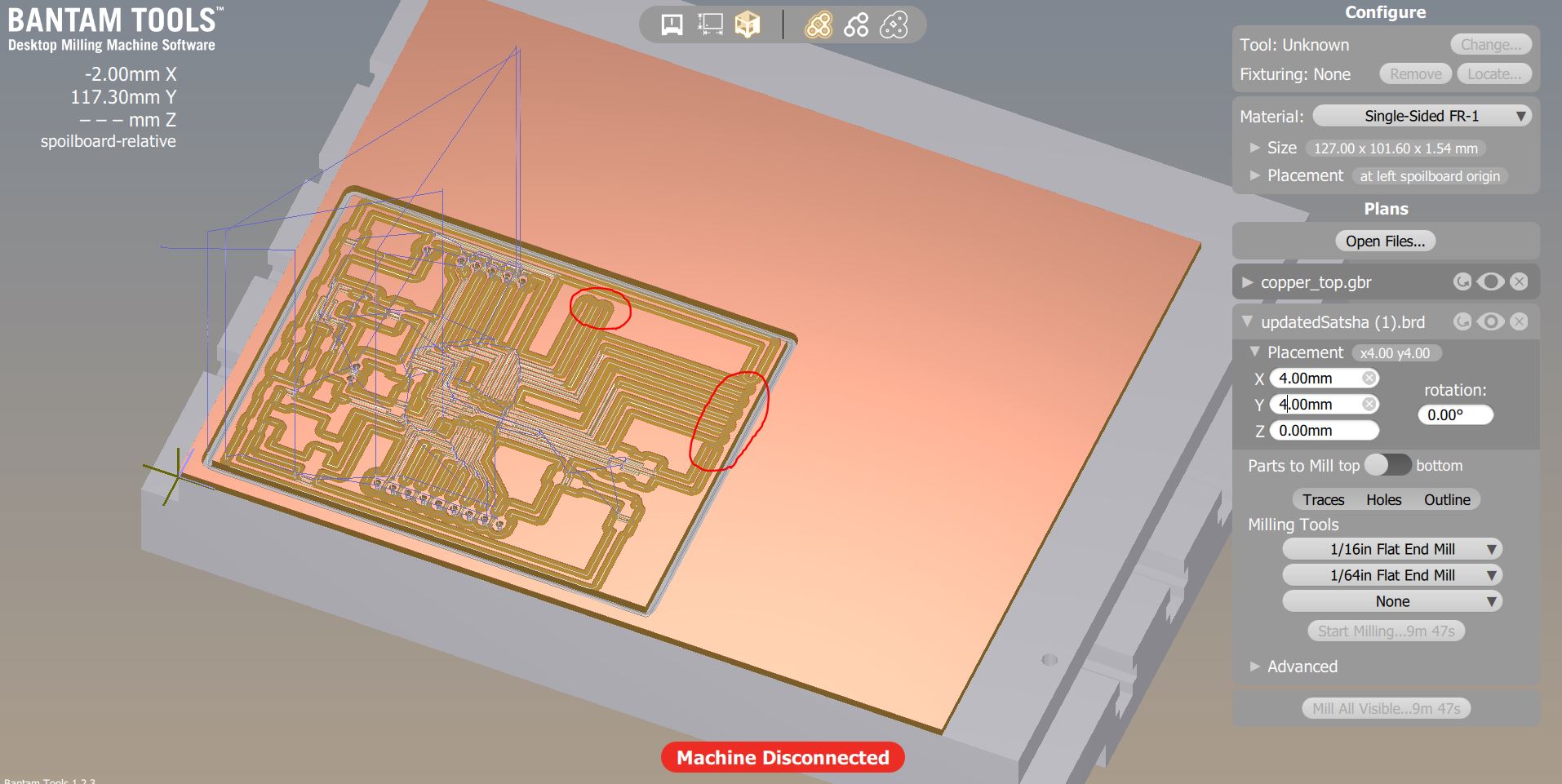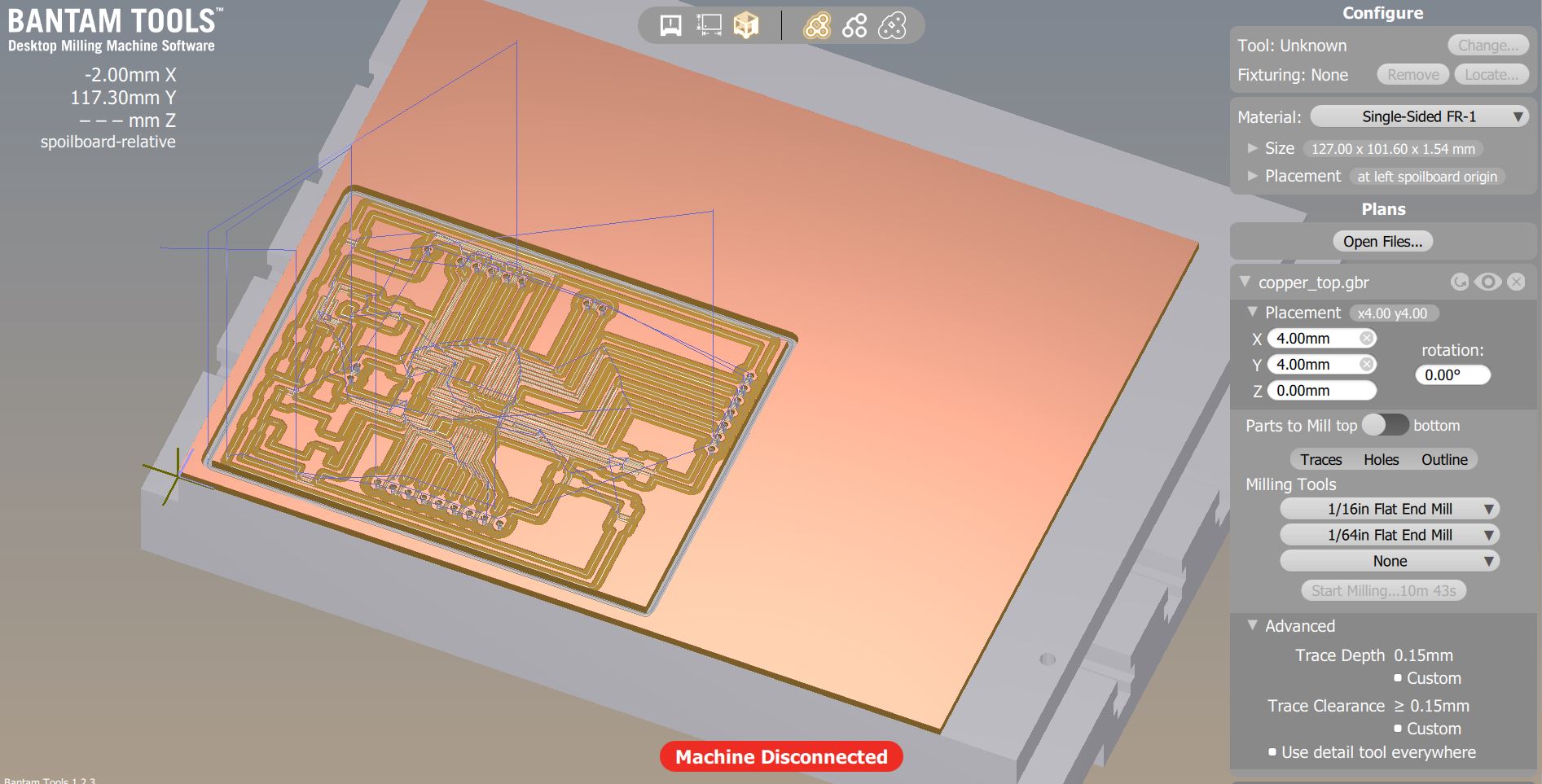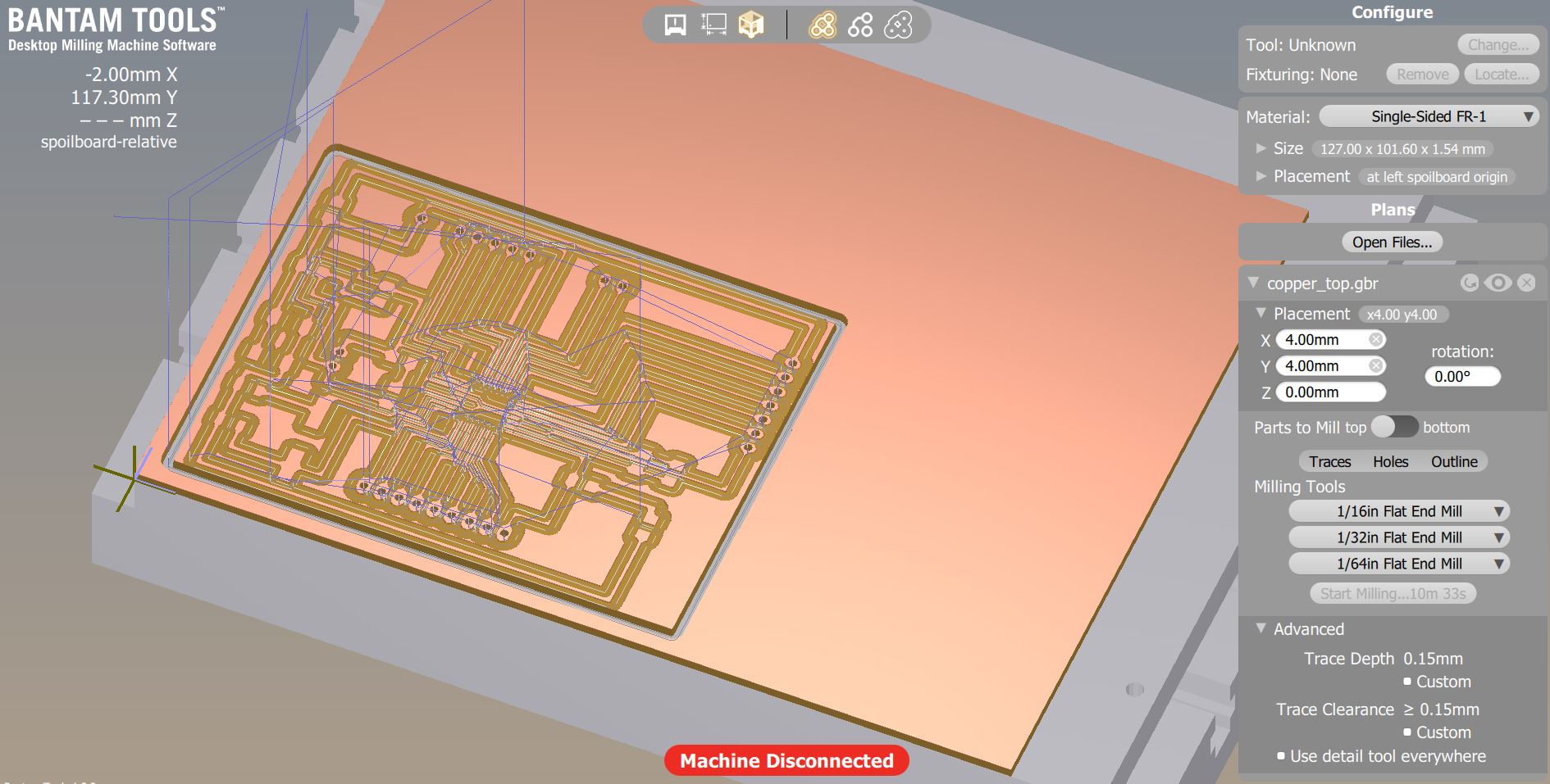 After my board file was complete, it was time for me to mill out my board. I milled out my board using a 1/64th bit for the traces and a 1/16th for the outline. Here is how I set up my board in Bantam.