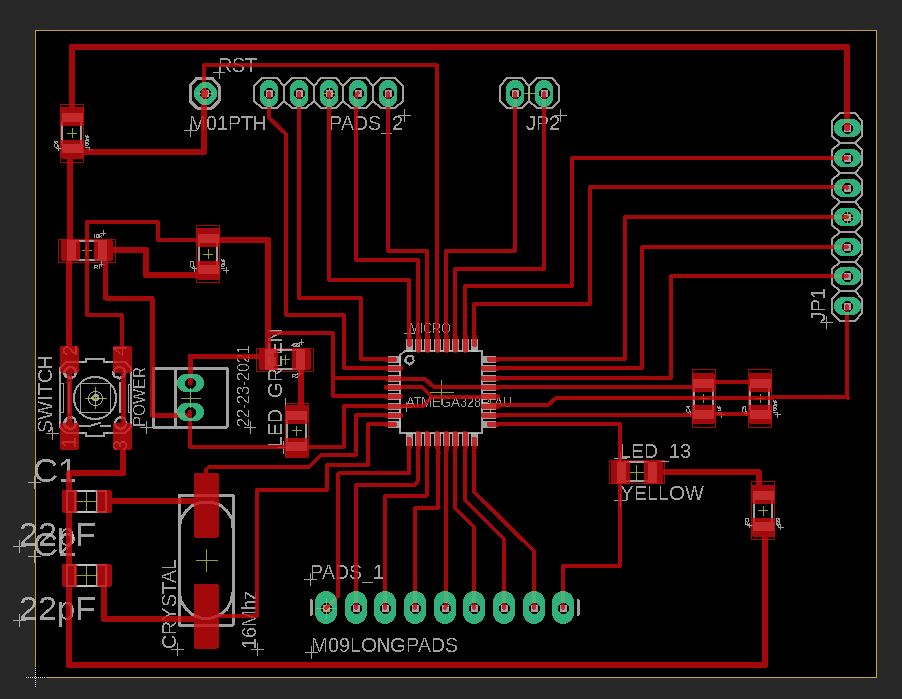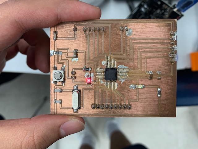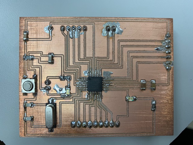 After everything was complete, I went over to burn the bootloader on the board, but I was not able to do it, and I realized that it was due to the small copper bits that were caught between my traces. Initially, I didn’t think it wouldn’t be much of a problem, but after grabbing a multimeter and running a continuity test, I realized there were small shorts created throughout the board. I realized that the best solution to this issue was to simply re-mill the board, but this time, used three bits (1/16th, 1/32th, 1/64th)to mill the board (I later realized I could just go under advanced and set the trace clearance higher, which I started doing from this point on). After setting everything, I milled out the board, sanded it, checked if there were no copper pieces in between the traces (which there weren’t) and then I stuffed the board. Here is how it turned out:
