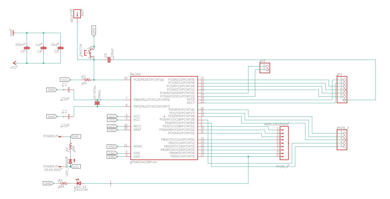After I downloaded the schematic and board I went on EAGLE to modify the design. Since I was using I2C communication for this week, I decided to move the I2C pins separately as it would be easier to access and will be easier to identify. Here is what my schematic looked like after I made my changes