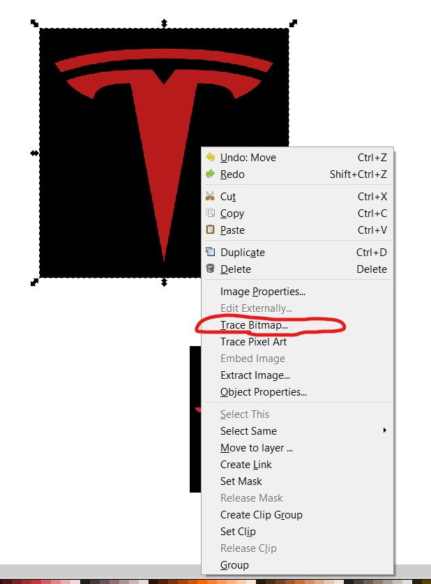 Obviously, this by itself would not work for the task at hand, so I right-clicked on the images, and I selected trace bitmap, which would help me turn these images into usable shapes.