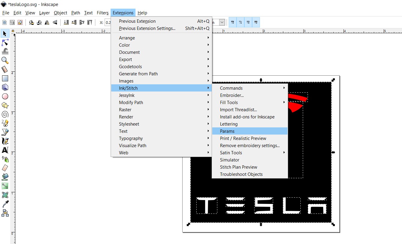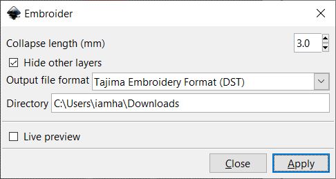 After I had completed this, I decided to export the file. In order to do this, I had to go into extensions > embroider.. Which then a screen popped up, where I was able to select the file type, which is a DST file, and was able to save.