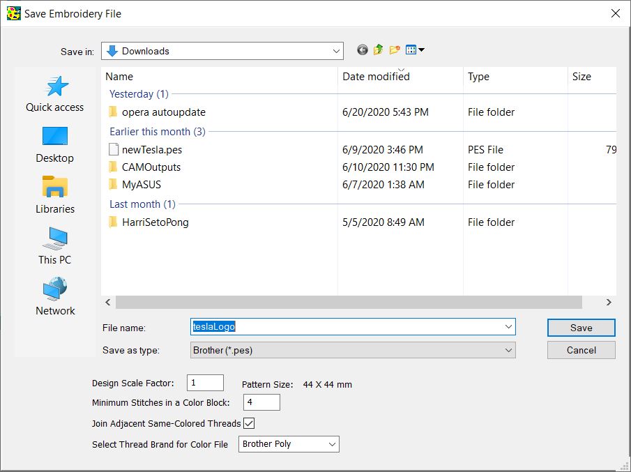 Although you can save it this way, I pressed cancel, which led me to this pop-up to show, in which I saved my file as a .pes file, which is the file for the Brother embroidery machine, which is what we have at the lab.