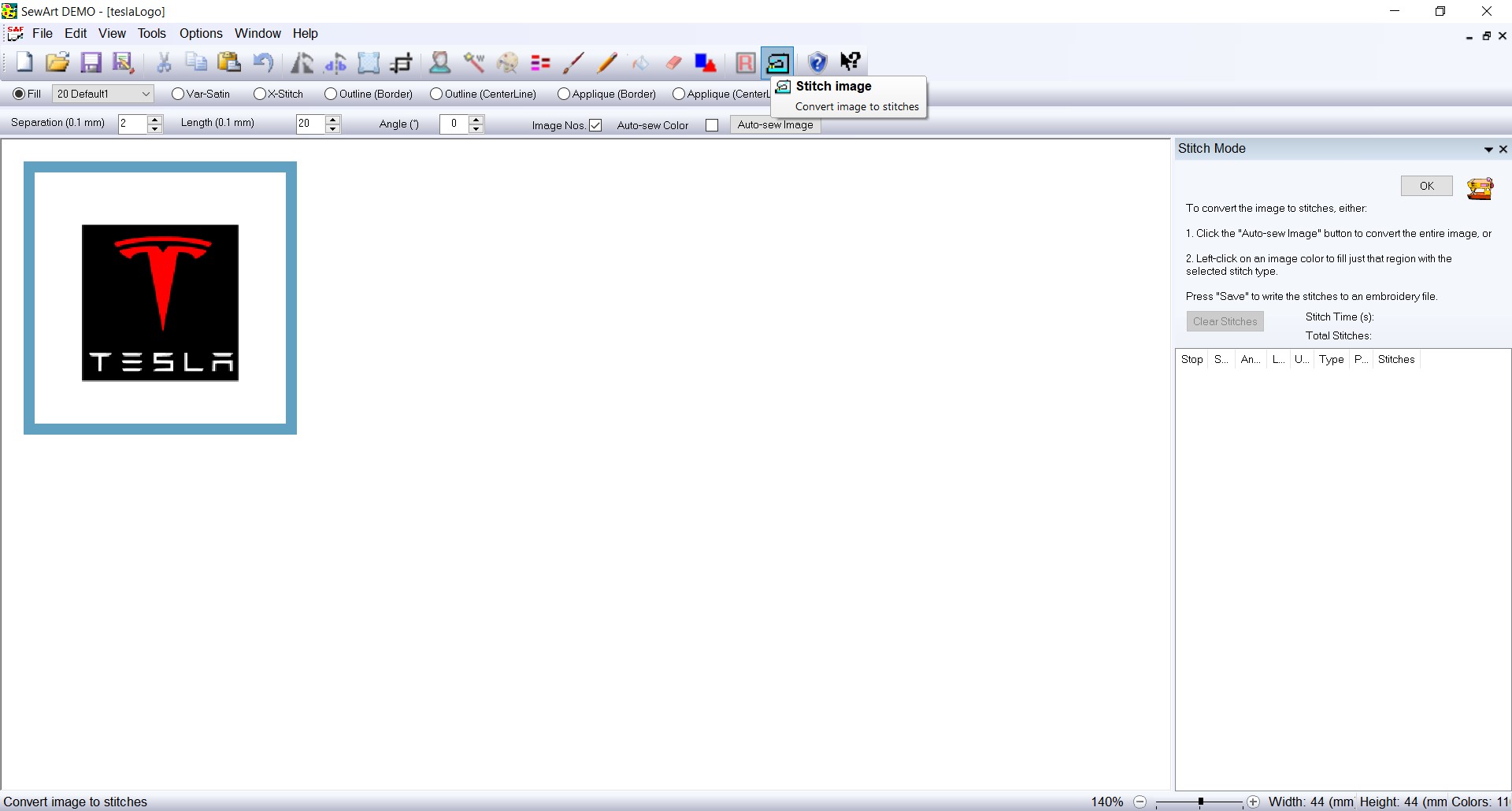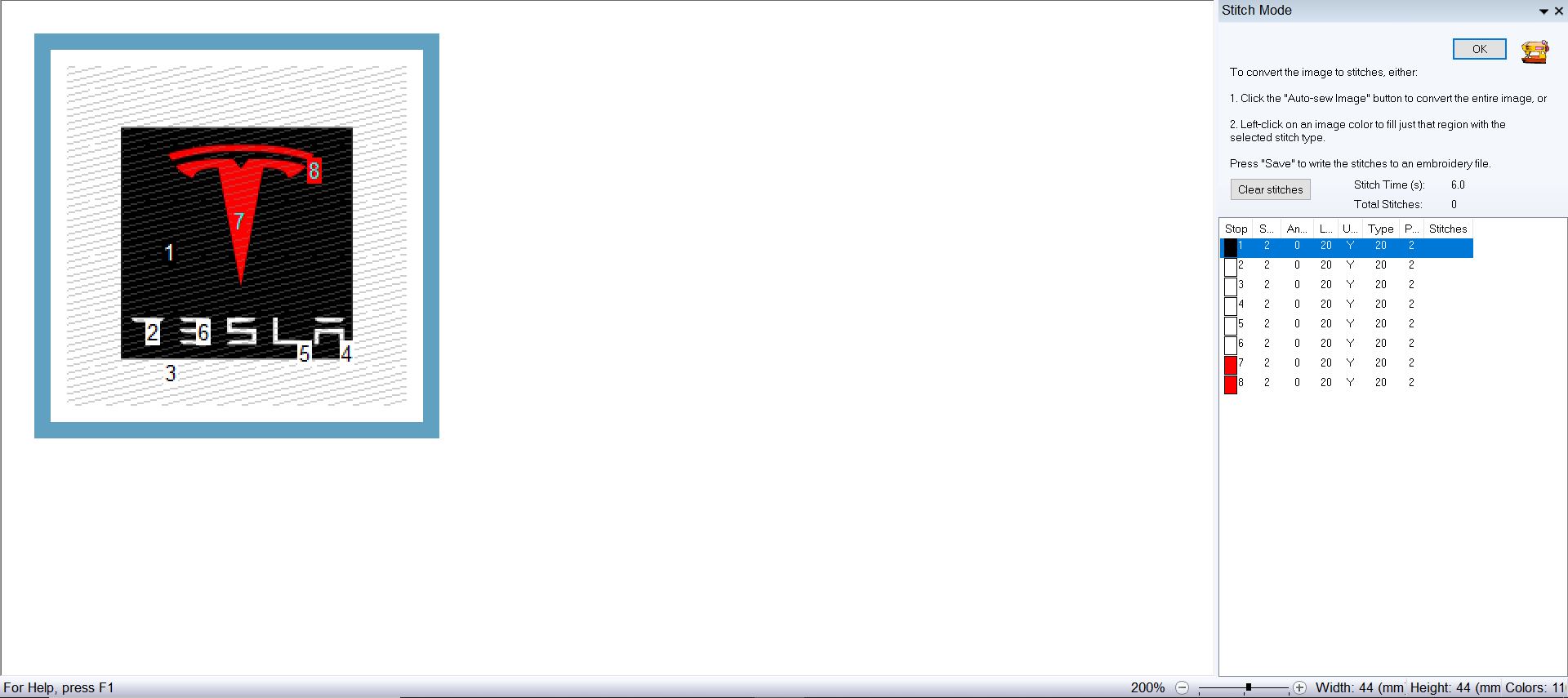 After I got my svg in SewArt, I cropped my image to the size I wanted and then I created clicked on the button that said stitch image, which took me to the stitch mode. This mode allows me to turn the svg into an embroidery file that I could upload on the embroidery machine. In this mode, there is an option to manually select the colors that you want in your file or you can use the Auto-sew function.