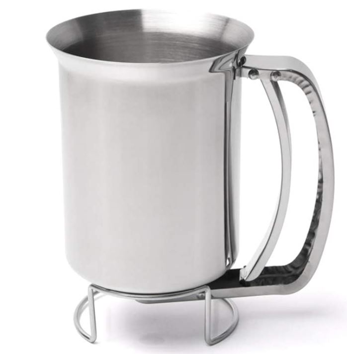 There were many ideas for a possible release mechanism, some of which included a rotating lid with a hole that would release the batter once it aligned with the nozzle and a mechanism to squeeze a bottle that would release the batter. After looking at the many possibilities, we decided that we would purchase this dispenser, which is activated by pulling on the handle as shown below.