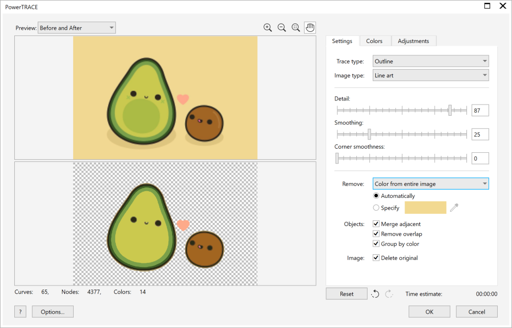 To trace the image, I first tried going to the “Bitmaps” drop down then selecting the “Centerline trace” feature using the “Line drawing” option, because a [tutorial] I found suggested it . I seletcted “line-tool” however the program preview only showed me one stray line traced around the big avocado, so I realized this wasn’t what I was looking for.