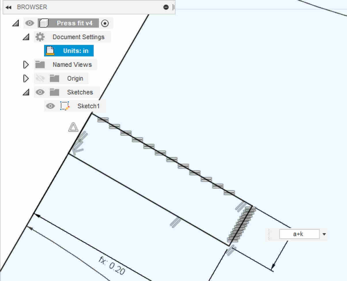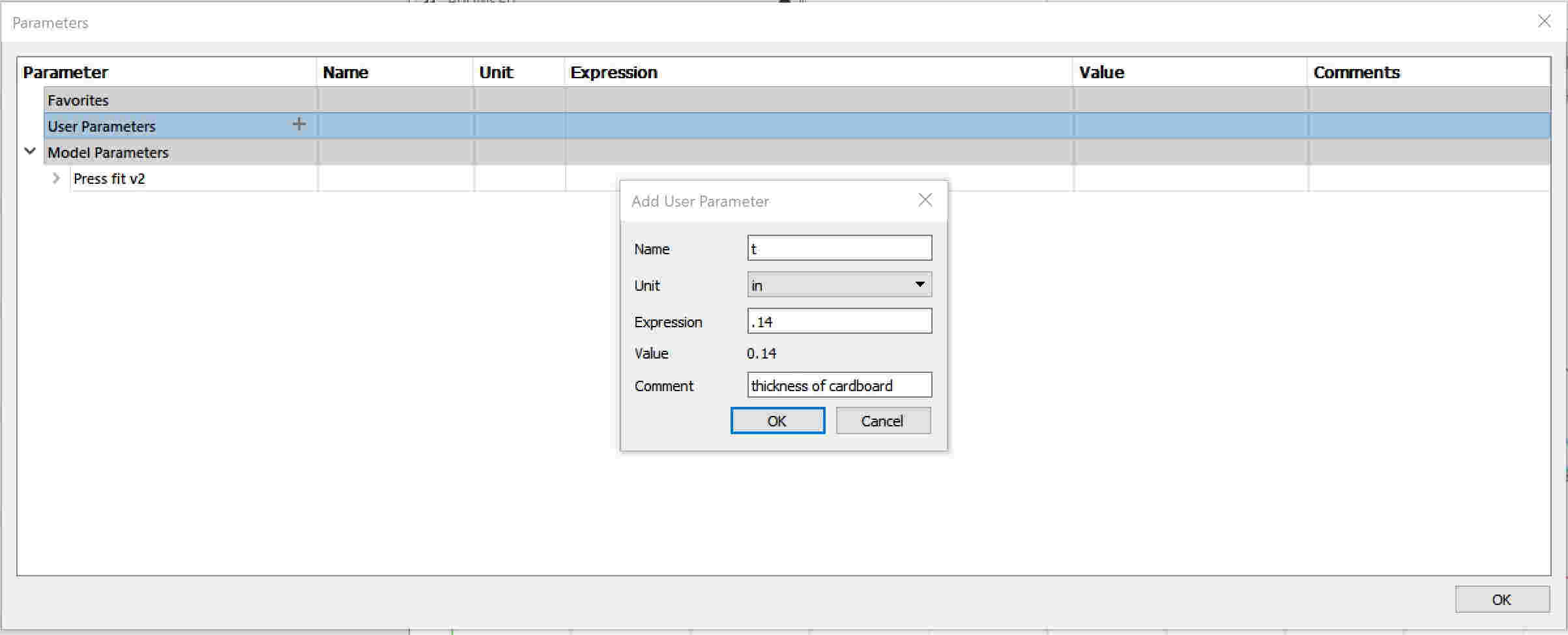 Finally, I navigated to “Modify” then to “Change Parameters.” Next to “Change User Parameters” on a pop-up menu there was a plus button, which I clicked, then made my first parameter called “t.” This will be for the thickness of the pieces, probably .14 but it’s of if that wrong because it is an easily changeable parameter. I also changed units to inches. I hadn’t done this in the beginning, but I then went into the “Browser” right hand menu and changed the units.