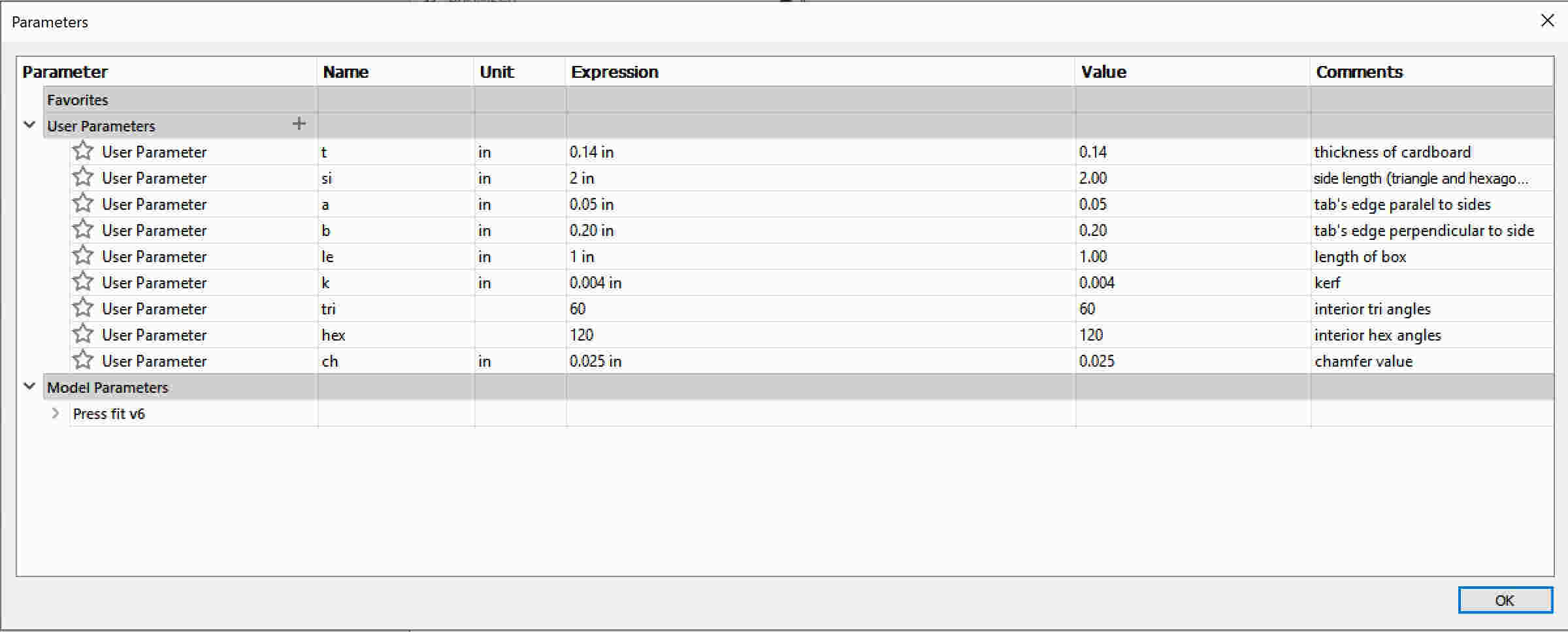 I was also chatting with my peers in the Latin Lab, and I found out they were chamfering all their edges so the slots went together easily. I decided to add this as my final parameter. Final parameters:
