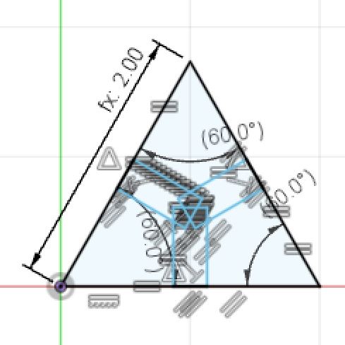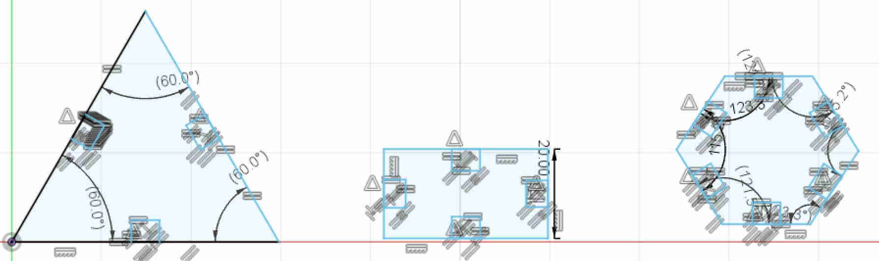 I then began to apply constraints to the dimensions. I set all the sides and the angles of the triangle and hexagon equal (separately). Trying to set dimensions on the angles threw an over constraining error, and prompted me to set the dimensions as “driven dimensions” (meaning they would change as the other dimensions changed. It also didn’t allow me to set constraints on every angle (again, overconstraining it). I think all the angles will change anyways, because of the nature of hexagons. When some angles are the same, the other angles will be forced to also be the same.