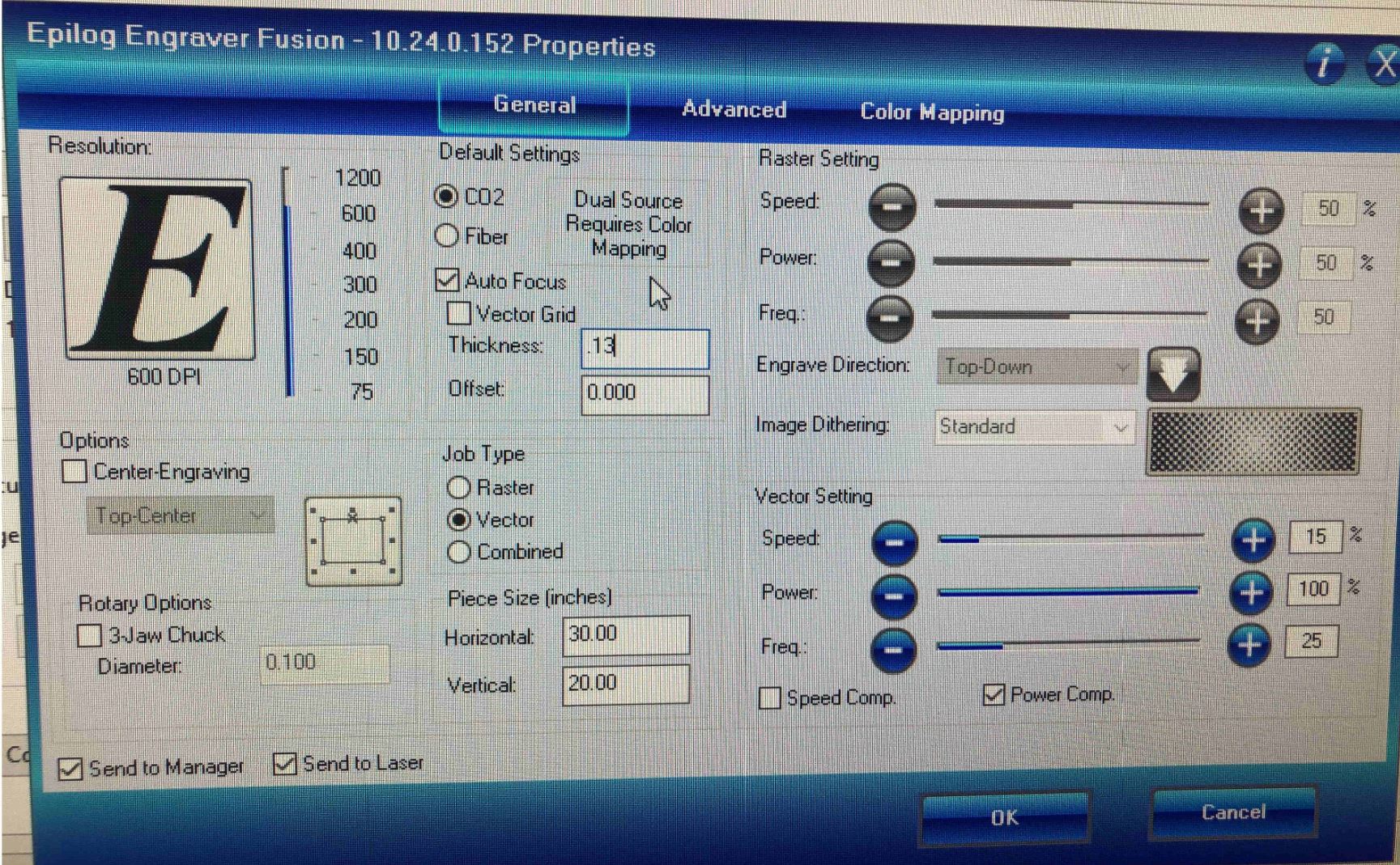 I then went to “File,” “Print,” “Preferences” to change my settings to what they needed to be for the .14 inch cardboard I was using. I set the speed to 30%, power to 100%,and frequency to 25%. I made sure the “Job Type” was set as Vector. Unfortunately, The first time I tried to cut my shapes, I forgot to turn on the “auto- focus”button and set the thickness of my cardboard. This drastically affected my cuts so I ended up having to redo it. Correct preferences: