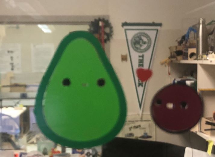 I put it on the window. Final product! I got an air bubble under it the first time so I tried to peel it back and fix it, this just made my parts further away from each other. I ended up taking the thin black outline off the avocado because throughout this process I pulled on it enough times that the vinyl started to warp :/.