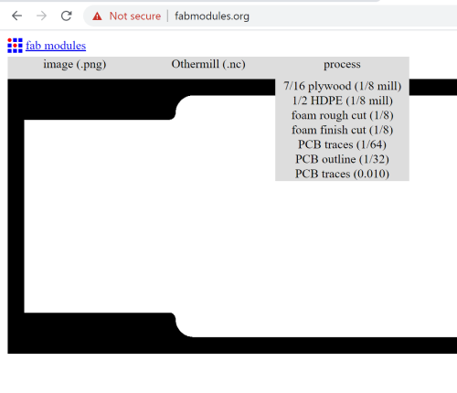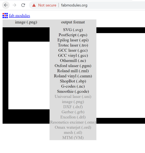 But before we could actually cut them out we needed to make them into and making them into something the mill could read and execute as cuttable/millable toolpaths (g-code). To make this g-code we used the Fab Modules Page. There is also a Fab Mods Page but we chose to use the former. Once you have navigated to the page, simply select “Input Format,”