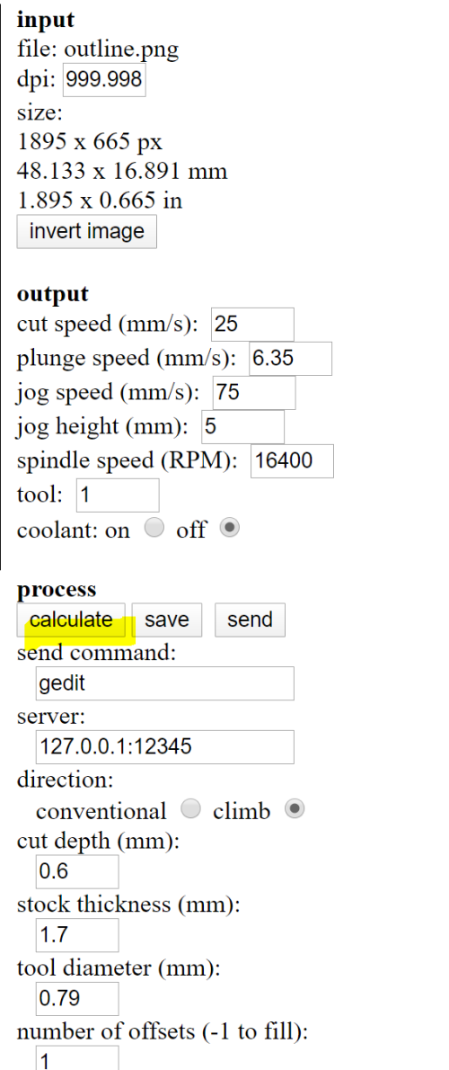 Finally, select “Calculate” under “Process,” and this will calculate the toolpaths for you. Hit “Save” and your files will be saved. Repeat the process with the Trace file (note; select 1/64th under “Process”). And you will have both the files you need.