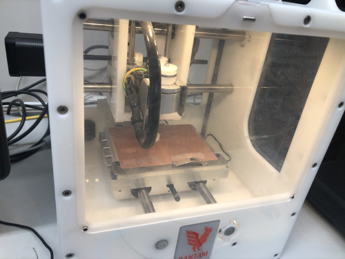 In the last photo, you can see that some of our traces look different from the others. This is due to our material not being completely flat, so the height of the material (based on thickness of the material) wasn’t uniform throughout. We had to press it down flatter and move the position of the z axis down a few mm to get the bit to cut through all the way.
