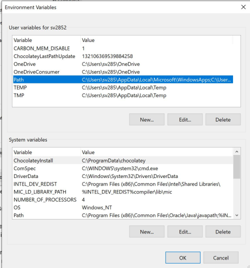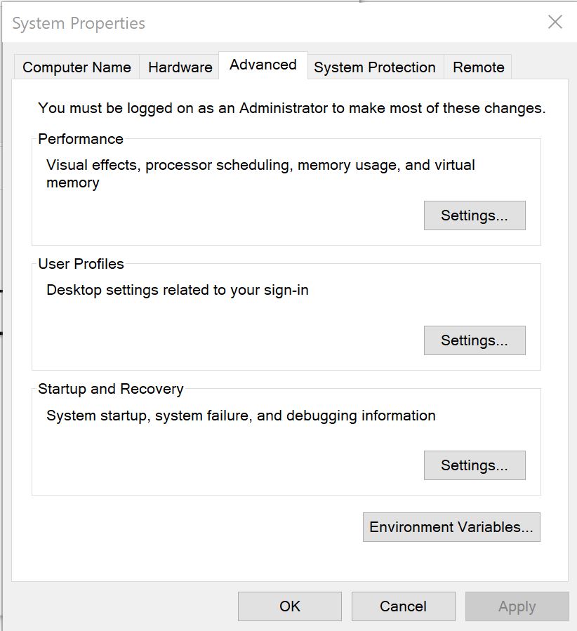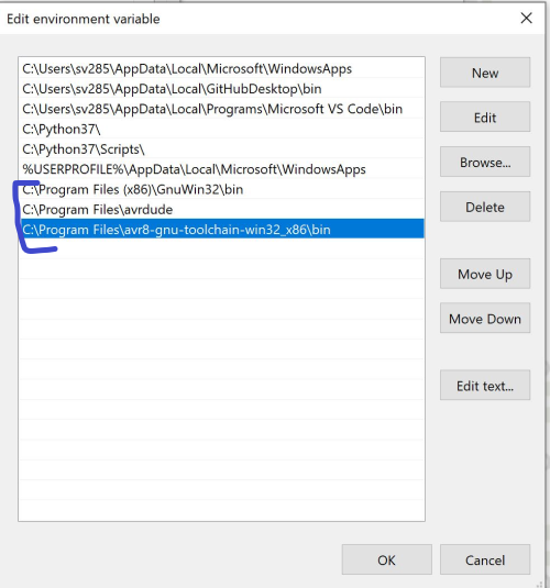 Then install AVRdude. Repeat the above, place it in “Program Files”. These are all tools we will need to access through the command line, but before we get to that our computers need to know how to get to these tools, so you need to add them to your path variable. To do this: Search “environment” in your search bar or navigate there from the control panel. It should bring the next image up.