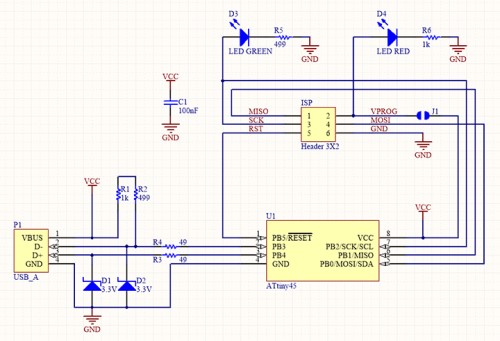 I soldered the ATTIny again, then did the resistors (they don’t have polarity, and I wanted to practice my soldering without having to worry about flipping another part and not noticing for a while). I then put in the capacitor(has polarity, look for the marks denoting the cathode side), and finally the diodes(also have polarity, and little marks denoting the cathode side). The images on the FabTiny tutorial were very helpful for seeing which direction the parts with polarity needed to be. I finished by putting the 6 pronged pin on (ISP header) and copied all the extra solder bridges on the photo, mainly the ones at the end of the USB (so it can be plugged in) and connected a bridge with little disconnected semi-circles. If you look closely, this leads to the major ISP pin on the 6 pronged ISP, and when you connect it, it allows this path to connect to a programmer. Without this connection, this currently un-programmed piece of PCB will not be able to be programmed. After it is programmed, I will remove the solder so there is no more connection and the board can no longer be programmed, it can only program other boards (which is the end goal).