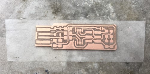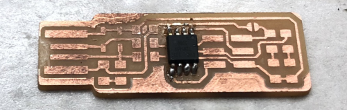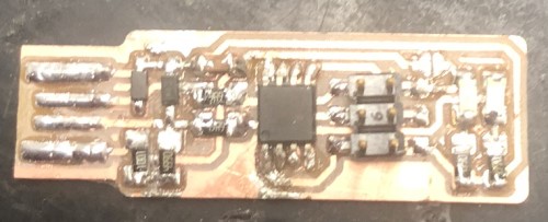 When we were done milling the traces and the cuts, we removed the copper, sanded stray traces, and began surface mount soldering. However, I almost immediately ripped up a trace so I had to remill my board. Me and a few others who had immediately ruined our boards experimented with using a .003 inch bit for the traces, which had been suggested to us earlier. However, we didn’t change out g-code file settings and later while soldering, we noticed the traces ended up being far too close to each other, which made soldering very hard, I kept accidentally making solder bridges between traces that were not supposed to be connected. Next time we will adhere to the 1/64th inch guideline.