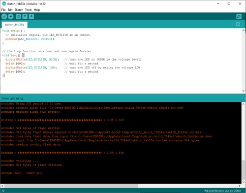 I then removed the solder closing the ISP bridge. To make sure my programmer could program other things, I uploaded a basic blink code from arduino onto it. After you open the app, under “Files,” “Examples,” “Example 1” I chose “Blink.” This loaded a code that will make the LED on the Arduino turn on and off.