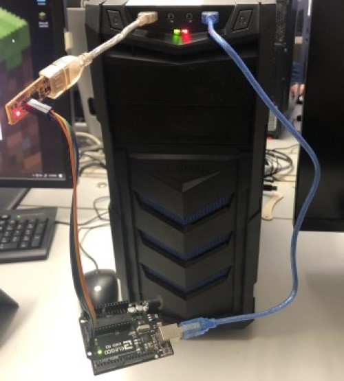 The I plugged the programmer into the USB port of my computer, and plugged the PCB into another random USB port connected to a computer so it would have power (the power doesn’t flow through from my computer to the PCB.” The red light will light up if this is working. I opened powershell, and did “cd” (changed directory) into the C drive and downloads file containing the GNU from earlier (also called fts_firmware…)