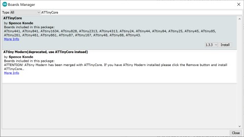 “ File -> Preferences, enter the above URL in “Additional Boards Manager URLs” Tools -> Boards -> Boards Manager… *If using 1.6.6, close boards manager and re-open it (see below) Select “ATTinyCore by Spence Konde” and click “Install”. ”