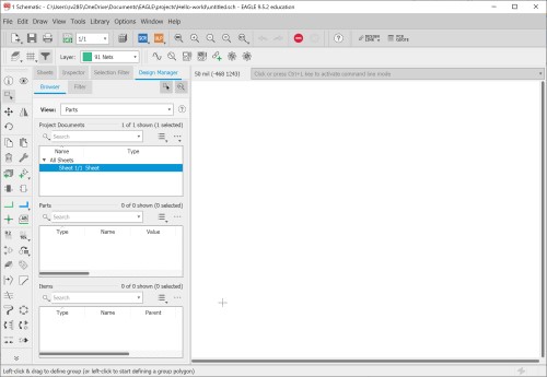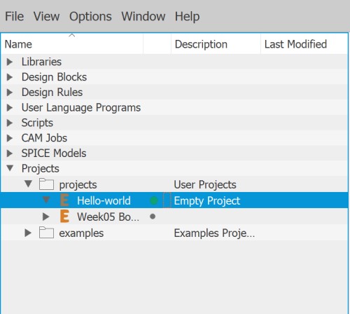 The first thing I did when designing my schematic for eagle was create a new Project under the Control Panel -> Projects tab. I then clicked it so the green circle would appear next to the project, telling me this project was “activated” or “in use.” I then right clicked and started a New schematic.