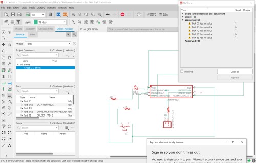 I ran an ERC, which is an electrical rule check, to see if I had any glaring errors with my electrical diagram. It doesn’t tell you things like “hey you need to connect TXD and RXD, and make sure everything is connected to the same ground,” but it did tell me I needed to assign values to my resistors and a few other parts.