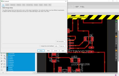 I ran a Design Rule Check (DRC) for the specific mill we are using, the Other Mill Pro by Bantam Tools. All DRC’s are is a set of rules you must follow to make sure your board is actually millable on your tool. There is a written out version of the rules which you can check manually, but running one is much faster. Other Bantam information on Eagle can be found here.