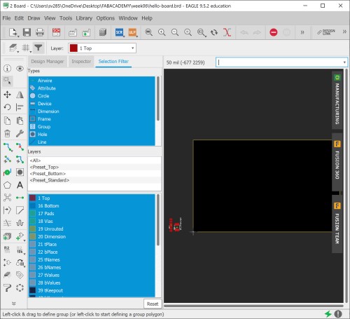 This week, the assignment was to redraw one of the echo hello-world boards that we made in week05,with an additional button and LED, check the DRC for this board, make it, and test it. We also had to use test equipment to observe the operation of a microcontroller board’s circuit.