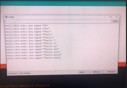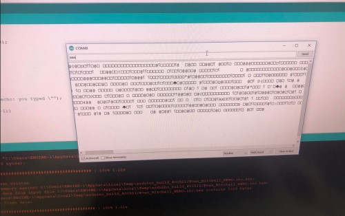 The only change I had to make was to change the line after “Serial Begin” to 5600, and changed that to be reflected in the baud of the serial port monitor. If you don’t do this you get gibberish. You also get gibberish if you plug the board in the wrong way. You can open the serial port monitor by going through Tools -> Serial Monitor. Once you have uploaded the code, remove the programmer and plug the board in directly to the com port (FTDI chip). Type “Hello World” into the Serial Monitor and you will get the following back, showing the board was able to send data, receive it back, and display the data it receives! (echoing it!)