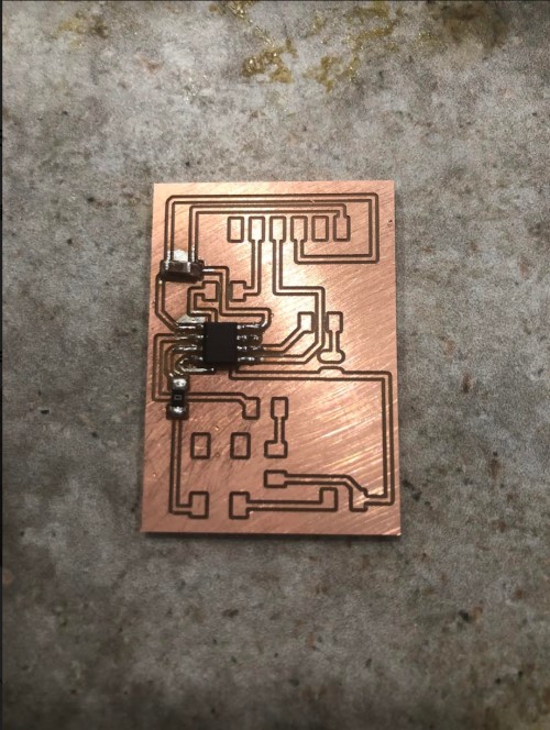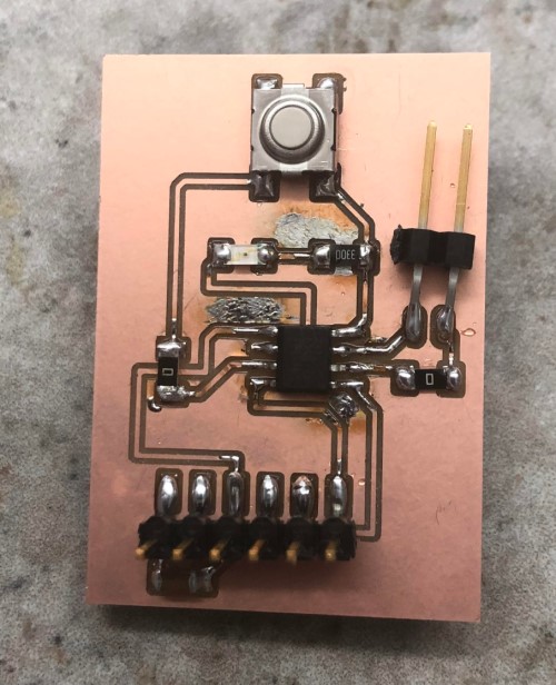 Once I milled the board, I soldered all the parts together.Surface mount Soldering is something I am relatively new to. I tried it in week5 and I wasn’t entirely pleased with my craftsmanship. You can find a lot more detail on my soldering process there too. However, I got a lot more practice this week and my board turned out much nicer.