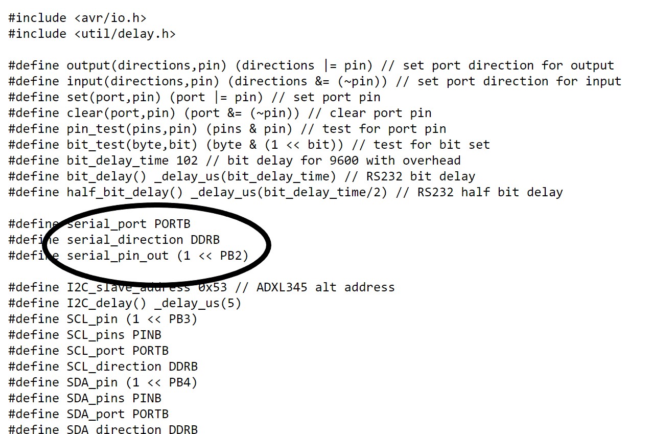 In this part, he defines his serial port as a pin on his attiny45. When looking back at the schematic, I saw that this pin was the RX pin. I rarely actually connect the RX pin. I realized the times that I use the serial port, it is always connected (So, I wrote this location as the RX pin. I also did not understand what “DDRB” meant, according to this site it references the bitmap oriented register that controls the Data Direction of each bit on Port B.” So, I just changed it to “DDRA” because my board uses Port A. I then changed all the other references to Port B and pins on Port B to Port A and pins on Port A. The alt address of the Adxl345 (which he has referenced in his code) is the same alt address as the adxl343, according to the343 datasheet. I am pretty sure the 345 is a breakout version of the 343, so this makes sense.