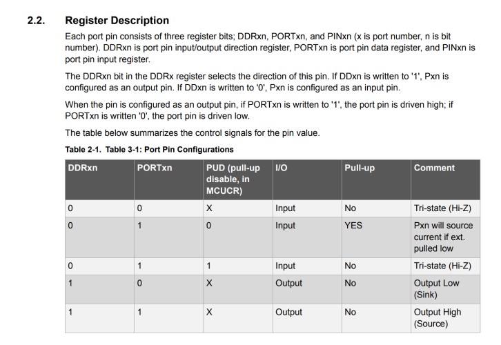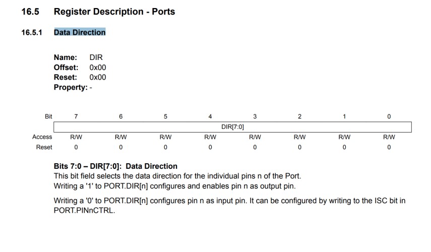 According to the quora I referenced to figure out DDRB, “PORTB is the register your code uses to set the port pins of Port B.” So I started looking over the datasheet for the actual register code for Port A on the attiny412. I could not find it, but I did find this sheet on port multiplexing, with this information about the registers: